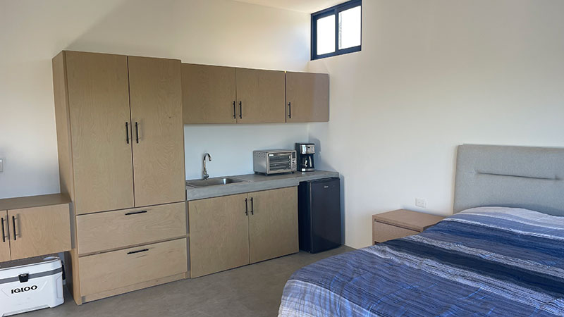 At Hotel La Buena Vida, you will experience the cool ocean breeze as you listen to the waves crash along San Pedrito Beach. Settle into your spacious King Bedroom Suite with full, private bathroom, convenient kitchenette with a sink, mini fridge, kettle, coffee maker and combination oven/air fryer/toaster. Then step out onto your patio and enjoy the ocean view.